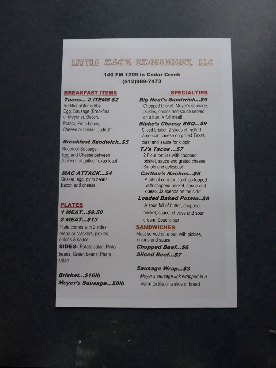 Welcome to Little Mac's Smokehouse, a gem nestled in Cedar Creek, Texas, where authentic BBQ meets heartfelt Southern hospitality. The menu showcases a variety of mouth-watering dishes that delight the senses. Start with their acclaimed Two Meat Plate for only $16, offering a choice of tender brisket or flavorful Elgin sausage accompanied by homemade sides like creamy potato salad and rich mac & cheese. For a lighter option, the One Meat Plate is available at $13.